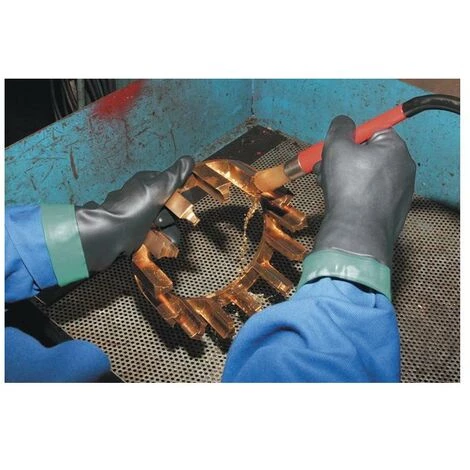 selon EN 388 · EN 374 · cat. III · matériau : velours de nitrile/chloroprÚne · exempt de latex naturel · haute résistance à une variété de substances dangereuses · bonne prise de piÚces humides et huileuses · forme anatomique · avec manchette · Application : industrie chimique, industrie pharmaceutique, travaux dans des secteurs de galvanisation, travaux avec des combinaisons de protection, usinage et traitement de métaux