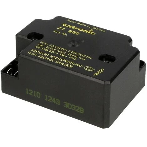 Le transformateur d’allumage ZT 930 est adapté à l’utilisation sur les brûleurs fioul, gaz et mixtes pour l’allumage de combustible. Il génère une tension d’allumage avec laquelle le brûleur est mis en service.Le dispositif d’allumage haute fréquence remplace les transformateurs d’allumage classiques de conception plus ancienne.