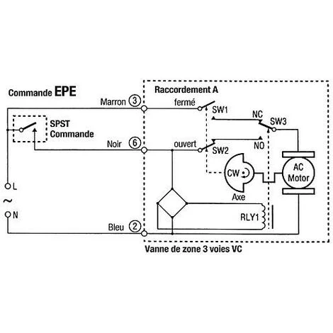Transmission avec commande EPE (unipolaire, à connexion) : en cas de besoin de chaleur, le contact du régulateur est fermé, RLY1 serre et ferme le contact NO du commutateur SW3. Il en découle que B est fermé et A ouvert. Quand A est complètement fermé, le mamelon ferme le commutateur SW1 et ouvre SW2. Quand le besoin en chaleur est satisfait, le contact du régulateur est ouvert. RLY1 se deserre et le contact NC dans SW3 est fermé. Quand le raccord A est complètement fermé, le mamelon ferme SW2 et ouvre SW1. La vanne de zone est à nouveau prête pour la prochaine demande de chaleur. En cas de panne de courant, la vanne de zone reste dans la position actuelle pour les 2 modes de fonctionnement. Quand le courant est reconnecté, la vanne de zone réagit à l’état du régulateur.
