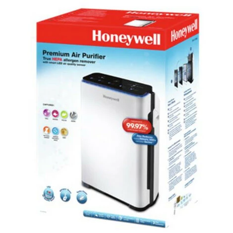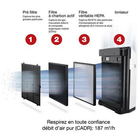 Purificateur d’air monofonction Honeywell HPA710WE4 avec capteur de qualité d’air intégré. Capture jusqu’à 99,97% des allergènes et particules microscopiques tels que les moisissures, les spores, le pollen, la poussière, la fumée et les squames d’animaux. Equipé de trois systèmes de filtration : 1. Pré-filtre pour capturer les grosses particules / 2. Filtre à charbon actif pour capturer les gaz, mauvaises odeurs et composés volatils (COVs) / 3. Filtre HEPA pour capturer 99,97% des particules microscopiques et des allergènes (0,3 microns et plus). Indicateurs électroniques pour savoir quand remplacer les filtres (remplacement sans outillage). 5 régalges de purification : 1. Ultra silencieux / 2. Anti germes / 3. Purification normale / 4. Anti-allergènes / 5. Mode Turbo clean pour une filtration rapide. Ioniseur intégré pour renforcer le processus de purification de l’air en aidant à attirer les particules indésirables vers les filtres. Mode automatique qui ajuste l’intensité de la purification en fonction de la qualité de l’air. Mode sommeil : fonctionnement silencieux et sans lumière. Economie d’énergie avec un moteur à courant continu (DC) qui permet aussi un fonctionnement silencieux.